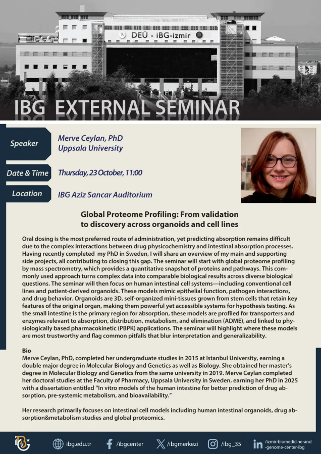 Subject Area(s): Cell models, proteomics, drug absorption and metabolismLocation: Aziz Sancar Auditorium, IBGContact: Selma ALTIN