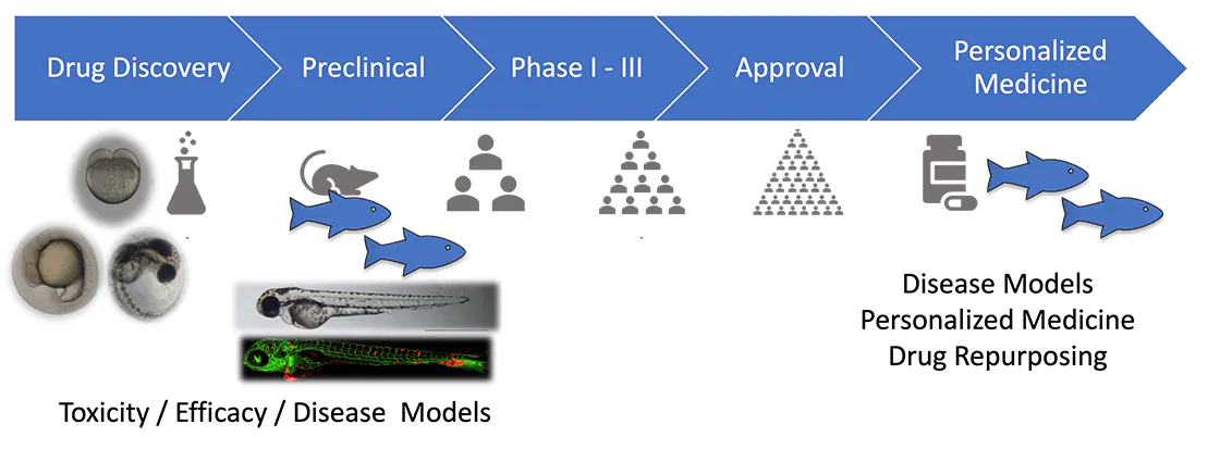 Zebrafish embryo and larval models are used as effective platforms for drug discovery and repositioning studies. In our laboratory, we develop product-based projects for drug testing. In this context, we develop transgenic or mutant zebrafish models, genetic or xenograft-based cancer models, and conduct drug testing. We conduct patient-specific cancer models in zebrafish larvae.