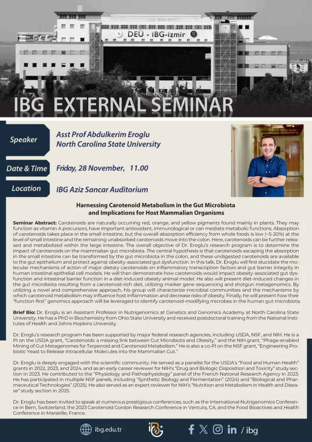 Subject Area(s): Gut Microbiota, metabolism of carotenoidsLocation: Aziz Sancar Auditorium, IBGContact: Selma ALTIN