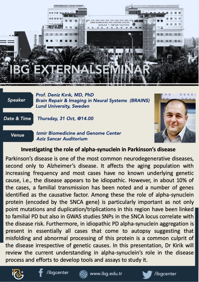 Subject Area(s): Parkinson’s Disease, Neurodegenerative DisorderLocation: Aziz Sancar Auditorium, IBGContact: Burcu İNCE
