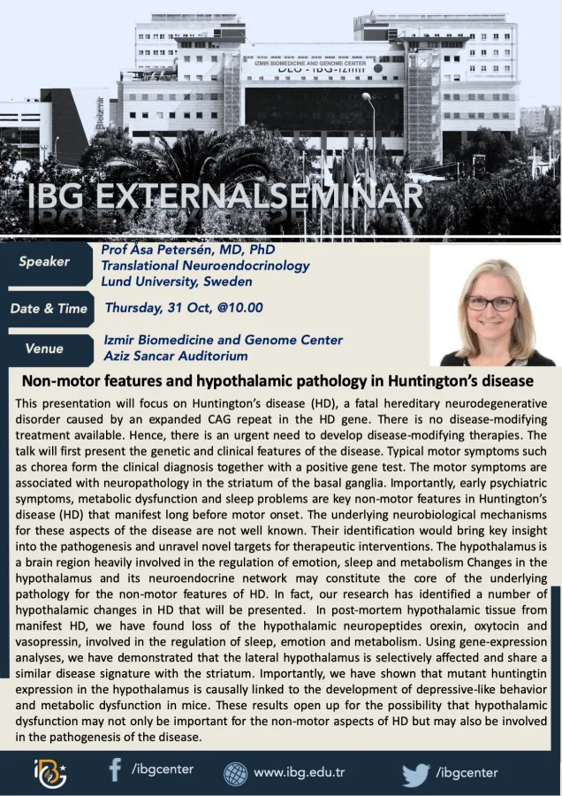 Subject Area(s): Huntington’s Disease, Neurodegenerative DisorderLocation: Aziz Sancar Auditorium, IBGContact: Burcu İNCE