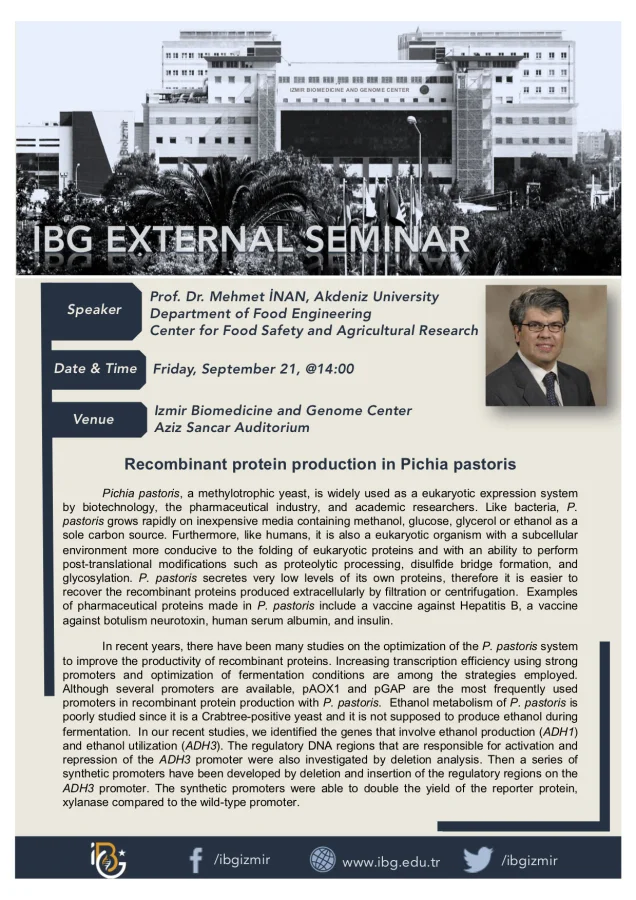 Subject Area(s): Protein Production, Pichia PastorisLocation: Aziz Sancar Auditorium, IBGContact: Berrak SOHTORİK