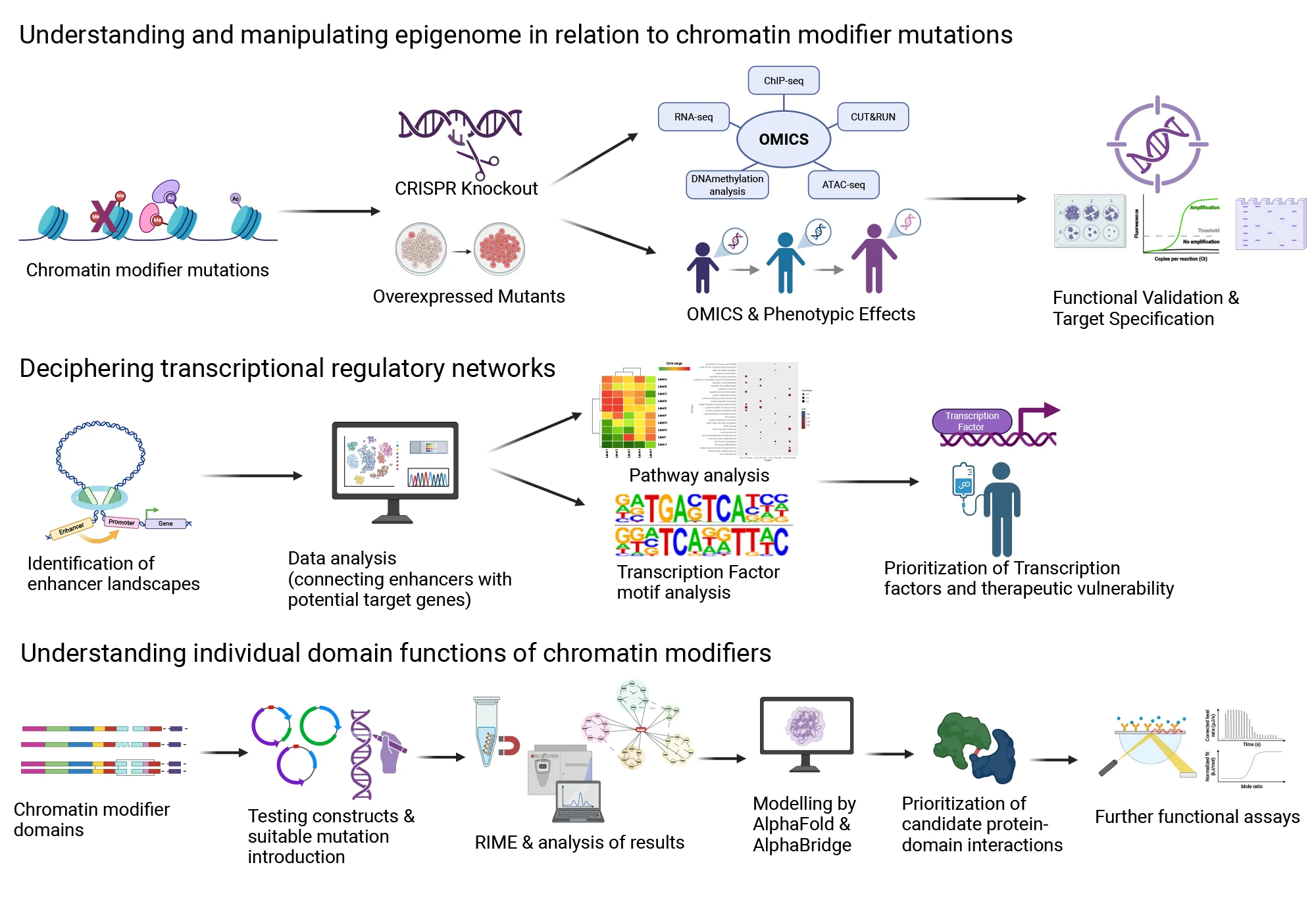 Epigenetik düzensizlik, sık görülen kanserlerden nadir genetik hastalıklara kadar çok geniş bir hastalık yelpazesinin temelinde yer almaktadır. Laboratuvarımız, gen düzenleyici mekanizmaları doğrudan kromatin seviyesinde anlamak amacıyla çoklu-omik profilleme yöntemlerini ayrıntılı biyokimyasal ve fonksiyonel analizlerle birleştirmektedir. MLL/COMPASS histon metiltransferaz komplekslerinin bileşenlerini kodlayan genlerde bulunan patojenik mutasyonlar ve bu mutasyonların düzenleyici ağları nasıl yeniden şekillendirdiğine yönelik araştırmalar özellikle ilgilendiğimiz alanlar arasında yer almaktadır. Bu mutasyonlara bağlı oluşan epigenetik imzaları ve hedeflenebilir moleküler hassasiyetleri belirleyerek hastaları daha doğru şekilde sınıflandırmayı ve mekanizmaya dayalı tedavilerin geliştirilmesine katkı sağlamayı hedefliyoruz.