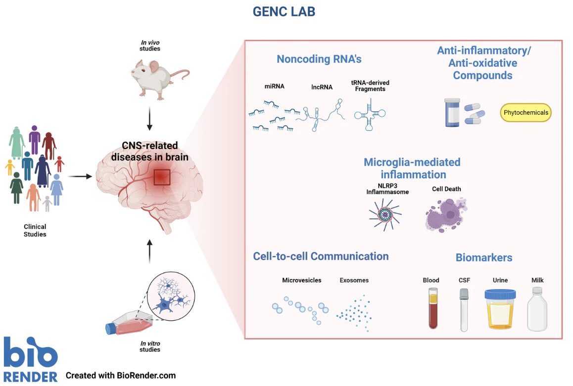 The Genc Neurodegeneration and Neuroprotection Laboratory focuses on understanding the molecular mechanisms underlying currently untreatable neurodegenerative diseases and developing novel therapeutic strategies. Our research targets cell death and neuroprotective mechanisms involved in neurodegeneration and neuroinflammation. In particular, we investigate inflammasome activation and its role in pyroptotic cell death, with a specific emphasis on microglial cells. Within the context of neurodegenerative diseases, we explore both innovative therapeutic approaches and early diagnostic possibilities, focusing especially on blood-based biomarker expression profiles. Through this approach, we aim to contribute to the scientific understanding of disease mechanisms and to the improvement of diagnostic and therapeutic processes.