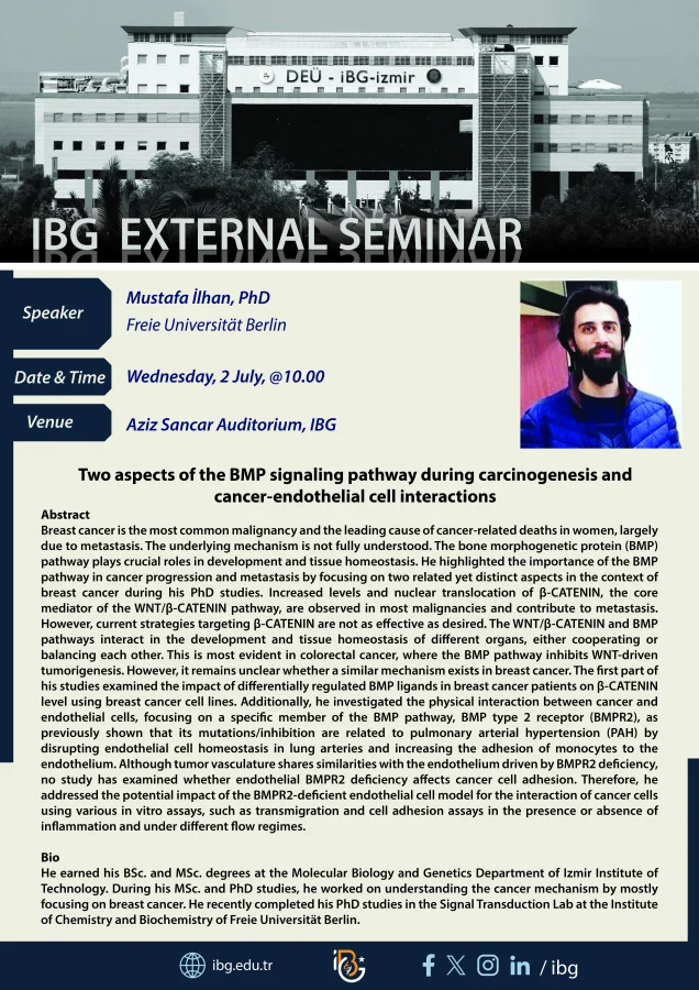 Subject Area(s): Cancer research, cell interactionsLocation: IBG Aziz Sancar AuditoriumContact: Selma ALTIN