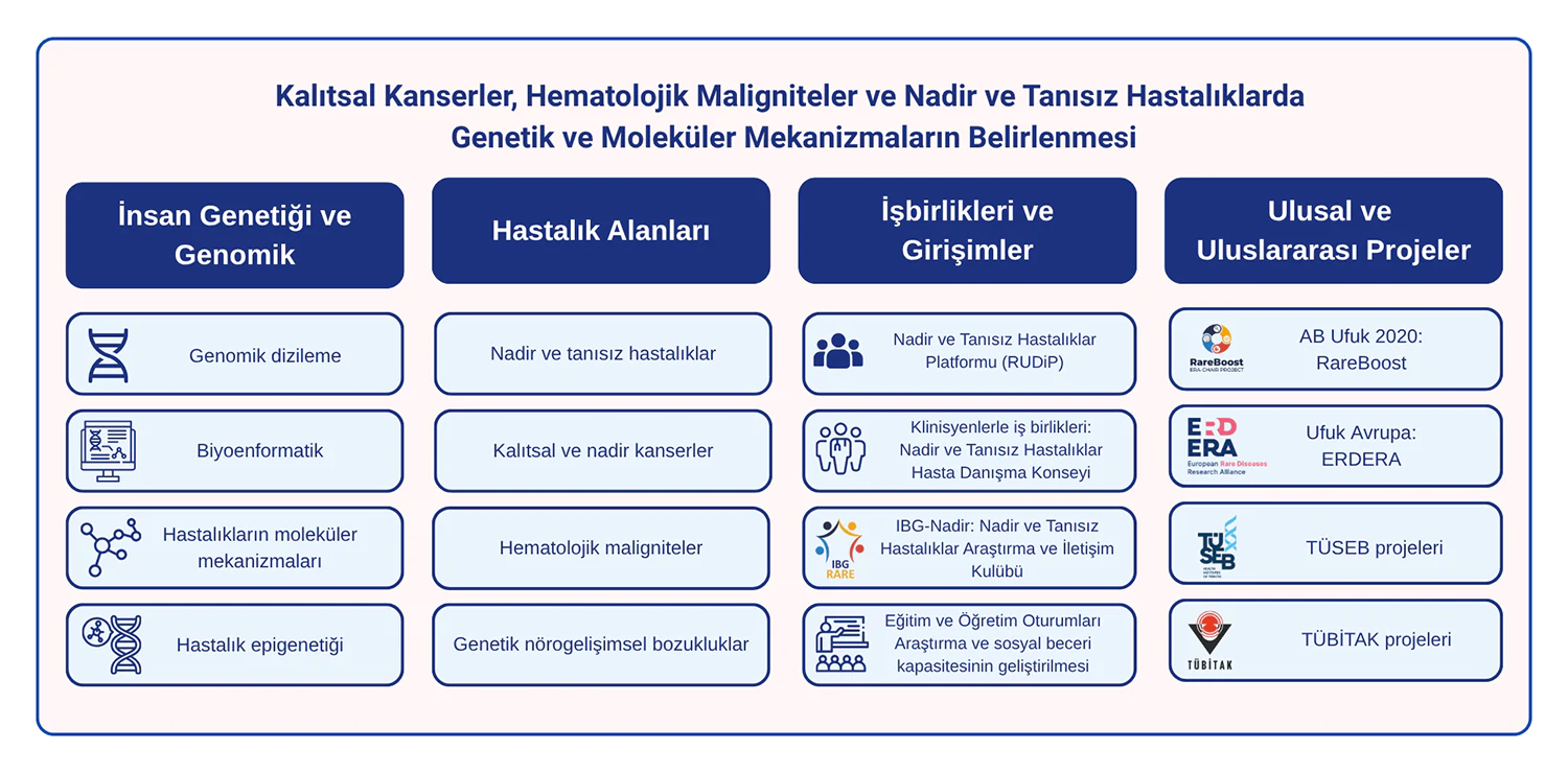 Prof. Özbek'in araştırmaları, kalıtsal ve hematolojik kanserler ile nadir ve tanısız hastalıkların altında yatan genetik ve moleküler mekanizmaları ortaya çıkarmayı amaçlamaktadır. Prof. Özbek ve ekibi, tüm genom dizilemesi, tüm ekzom dizilemesi ve RNA dizilemesi gibi genomik analiz araçlarını kullanarak, özellikle daha önce tanı konulamamış nadir hastalık vakalarında, hastalığa neden olan genleri ortaya çıkarma amaçlı çalışmalar yapmaktadır. Derin fenotipleme ve genomik analizin bir araya getirilmesiyle ekip, hastalıkların genetik nedenlerini belirlemeyi ve karakterize etmeyi amaçlamaktadır. Prof. Özbek ve ekibi, tanısız klinik vakaları çözmek ve nadir hastalıklar üzerine İBG’de yapılan araştırmaları ilerletmek amacıyla, ‘Nadir ve Tanısız Hastalıklar Platformu - RUDiP’ üyeleriyle yakın iş birliği içinde çalışmaktadır. RUDiP hakkında daha fazla bilgi almak için RareBoost projesi websitesini ziyaret edebilirsiniz: www.rareboost.ibg.edu.tr