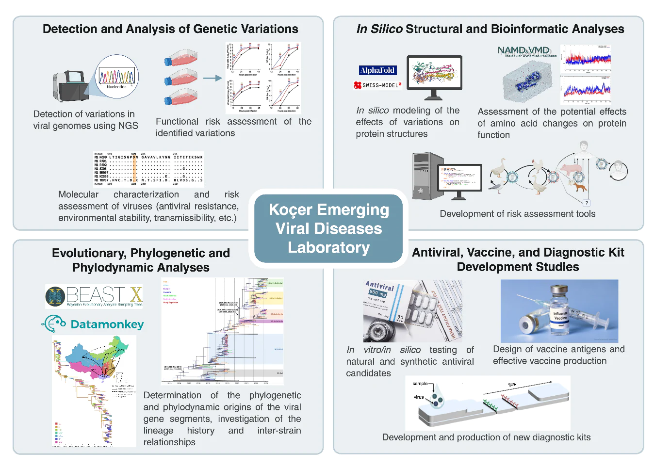 In our laboratory, we perform genome analyses and molecular characterizations of viral pathogens that cause infections in humans, particularly influenza viruses, and investigate viral evolution, ecology, and risk assessment through bioinformatics/computational analyses. Additionally, preliminary research related to the development of antivirals and vaccines for the treatment and prevention of viral diseases is among our laboratory’s primary research areas.